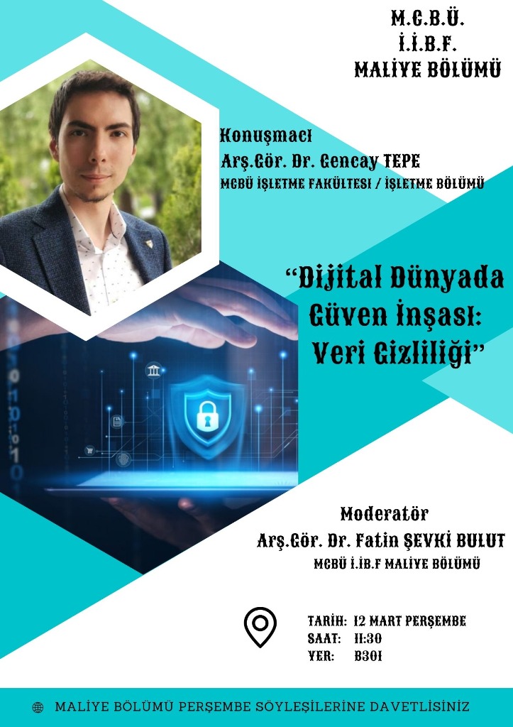 Bu hafta gerçekleştirilecek söyleşide, dijitalleşmenin hız kazandığı günümüzde veri güvenliği ve mahremiyet konuları ele alınacaktır. Arş. Gör. Dr. Gencay TEPE tarafından gerçekleştirilecek olan “Dijital Dünyada Güven İnşası: Veri Gizliliği” başlıklı konuşmada, dijitalleşen ekonomik ve sosyal yapı içerisinde veri güvenliğinin önemi, bireysel ve kurumsal düzeyde ortaya çıkan riskler ile güven inşasına yönelik yaklaşımlar değerlendirilecektir.